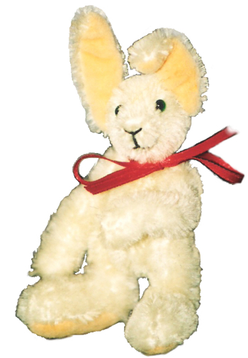 Pilegrimm ist aus weißem Mohair und aprikofarbenem Miniaturstoff gefertigt. Er ist 5-fach gegliedert. Er ist mit Synthetikwatte gefüllt.