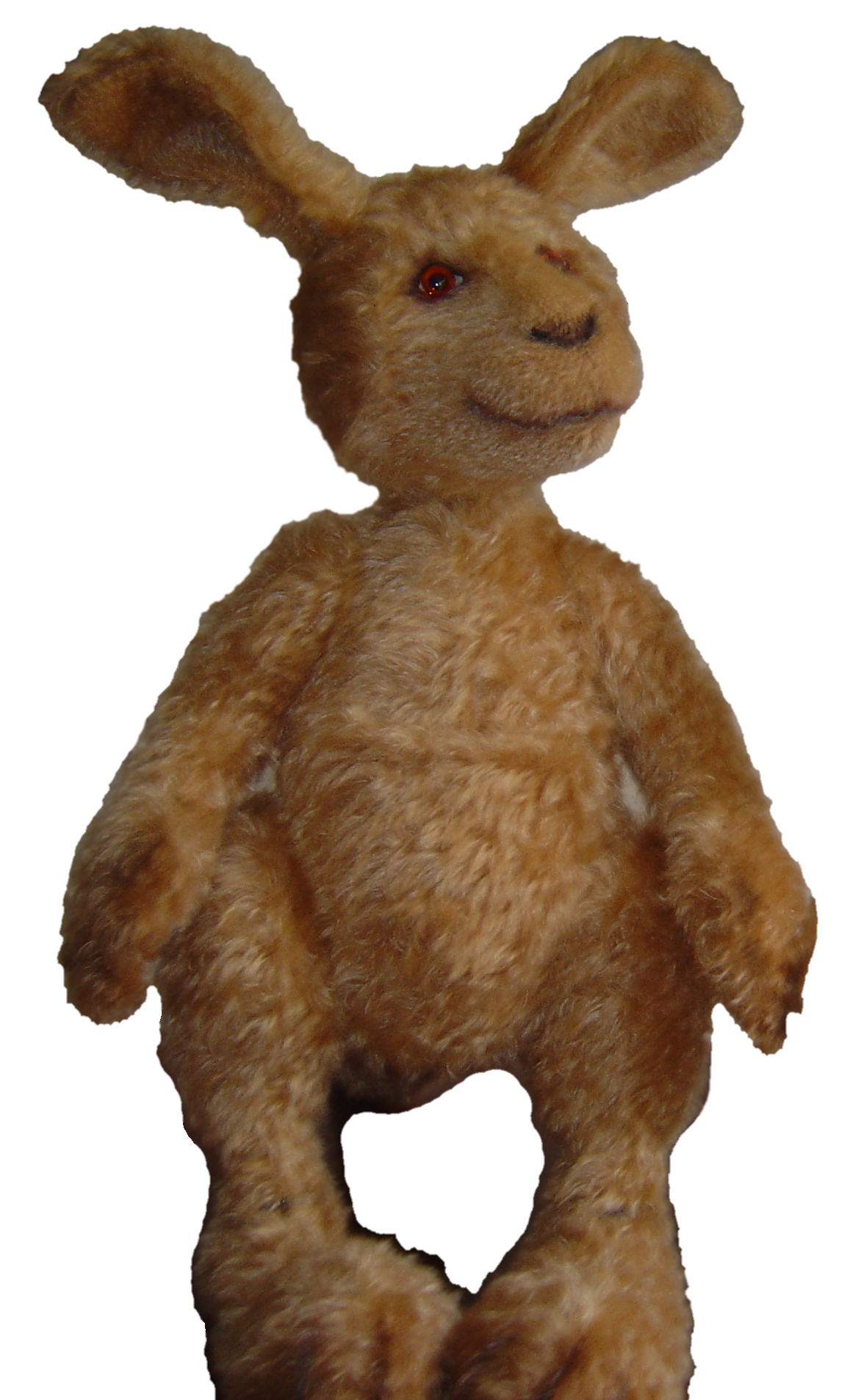 Das kleines Känguru ist aus hellbraunem Mohair gefertigt. Er ist 5fach gegliedert. Er ist mit Synthetikwatte und Granulat gefüllt.