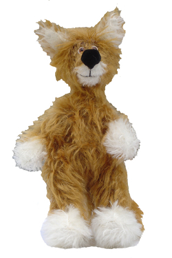 Leo ist aus blondem Kurz- und rotem Langhaarmohair sowie rosa Miniaturstoff gefertigt. Er ist 5-fach gegliedert und ist mit Synthetikwatte und Granulat gefüllt.