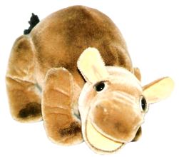 Wito ist aus rotgoldenem Mohair und braunem Miniaturstoff gefertigt. Er ist 5-fach gegliedert und mit Synthetikwatte und Granulat gefüllt.