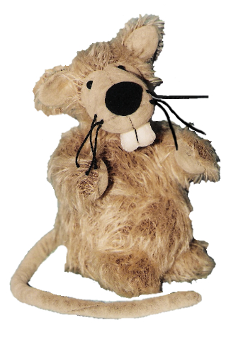 Ratz ist aus weißem Alpaka und schwarzem und braunem Miniaturstoff gefertigt. Er ist 5-fach gegliedert und mit Synthetikwatte und Granulat gefüllt.